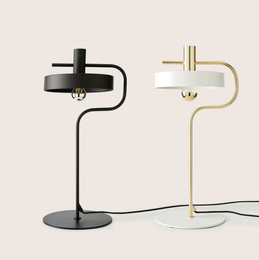 Aloa Table Lamp is made of steel, with a lacquered black matt or brass matt finish. Its design delineates a contrast of curved clean lines and smooth rectangular forms.
