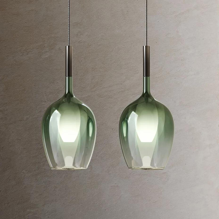 Suspension lamp with titanium, green water and coppered shiny coating glass diffusers and metal structure with iron grey, gold or chrome finish.